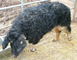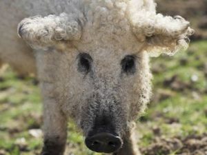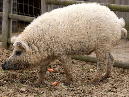Tem aparência de ovelha, lã de ovelha, cor de ovelha. De longe realmente parece uma ovelha, mas se você chegar um pouco mais perto descobrirá que é um porco. Um porco com lã? Isso mesmo. É de uma raça que quase chegou à extinção e que hoje vive na Hungria e no Reino Unido, a Lincolnshire Curly Coat.